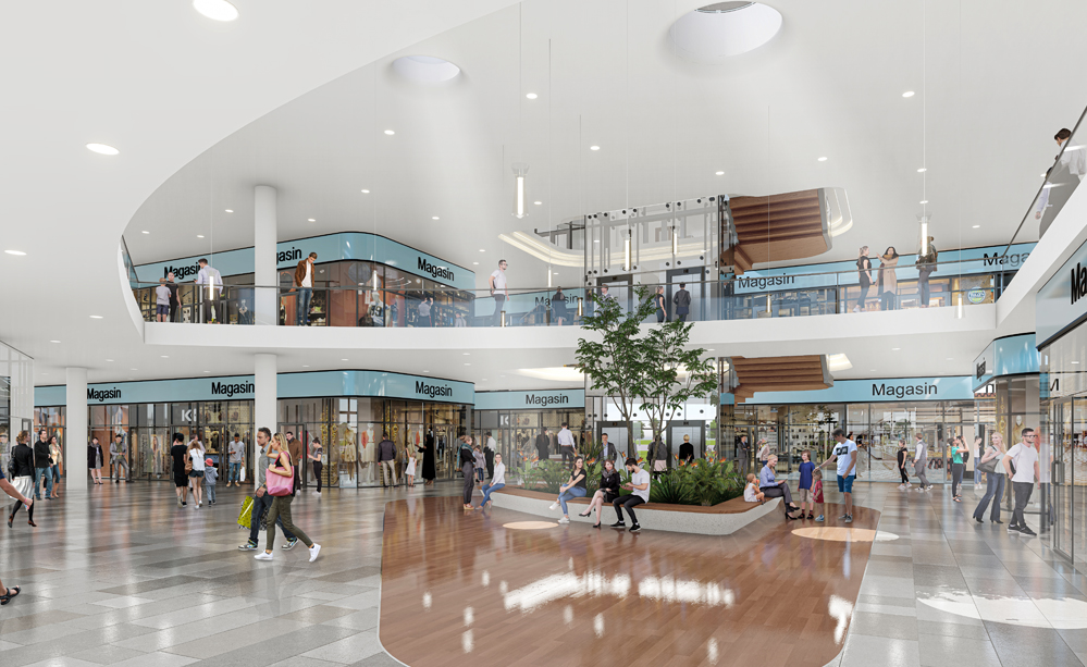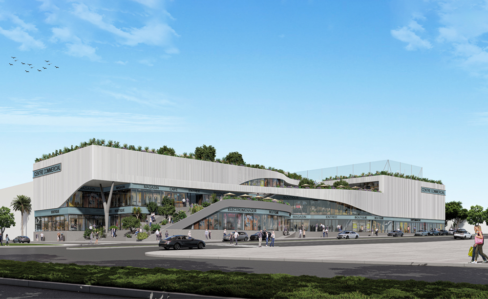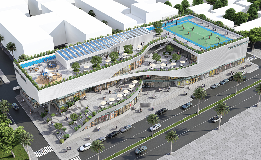 Les terrasses paysagères et la toiture accessible prolongent l’espace public et offrent des lieux de pause, de rencontre et de loisirs. Le végétal, pleinement intégré à l’architecture, participe à l’identité du projet et à la qualité de l’expérience usager. Le Centre Commercial s’affirme ainsi comme un bâtiment ouvert et accessible, contribuant à la création d’une nouvelle centralité urbaine pour la commune.